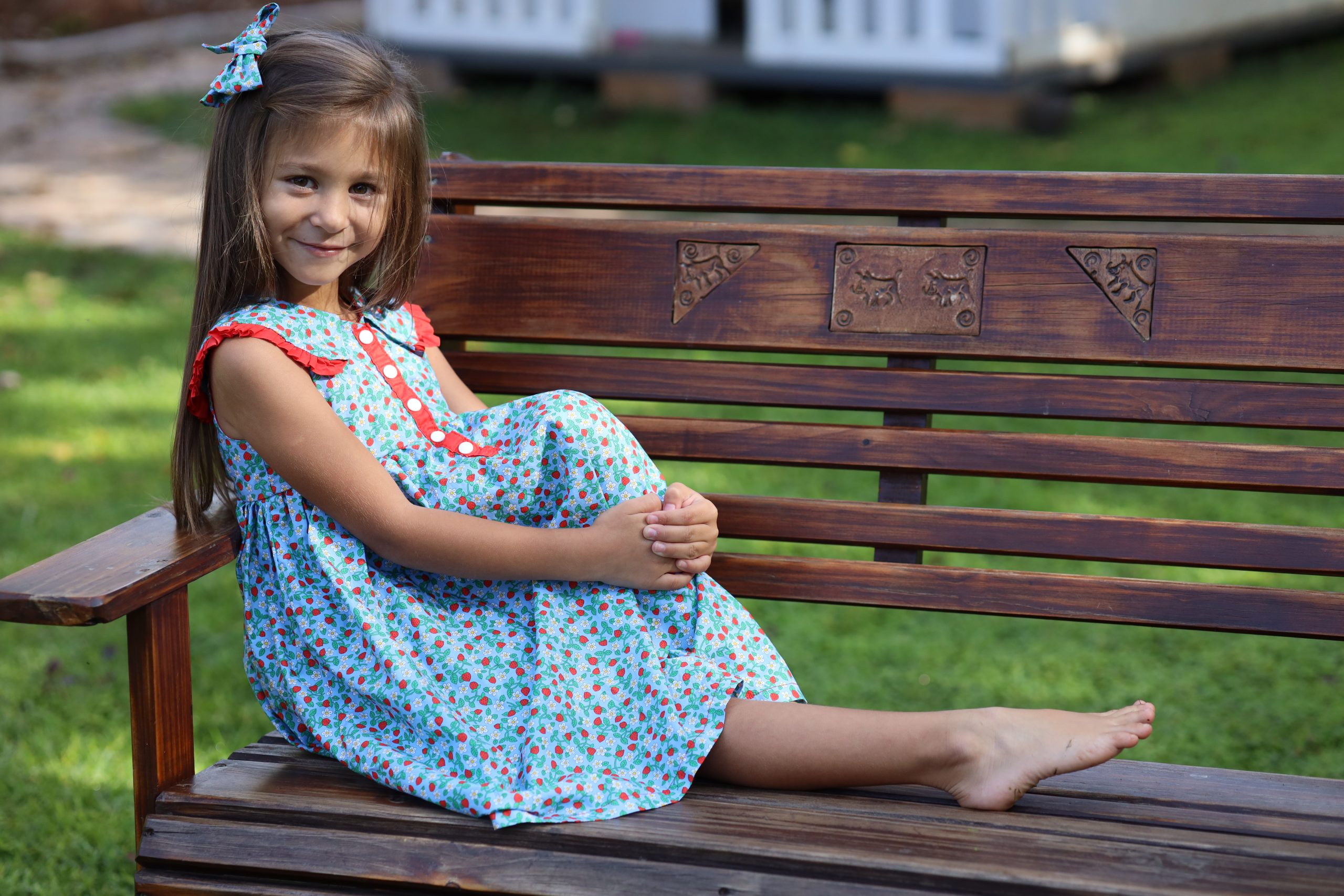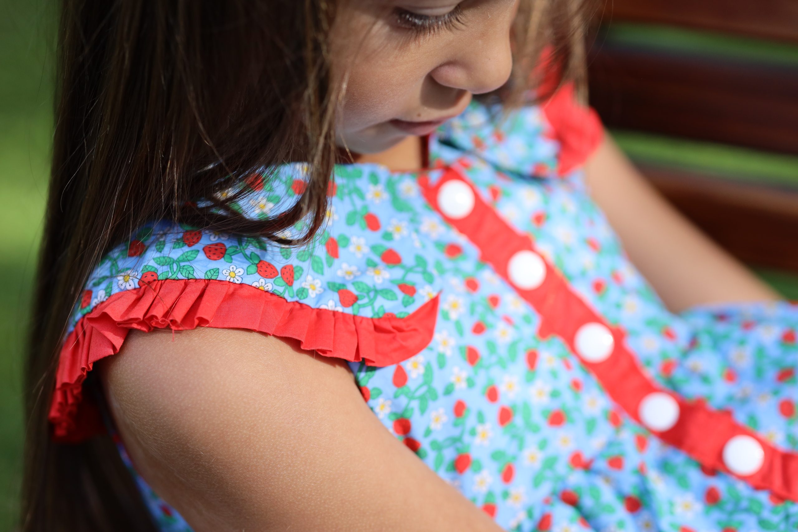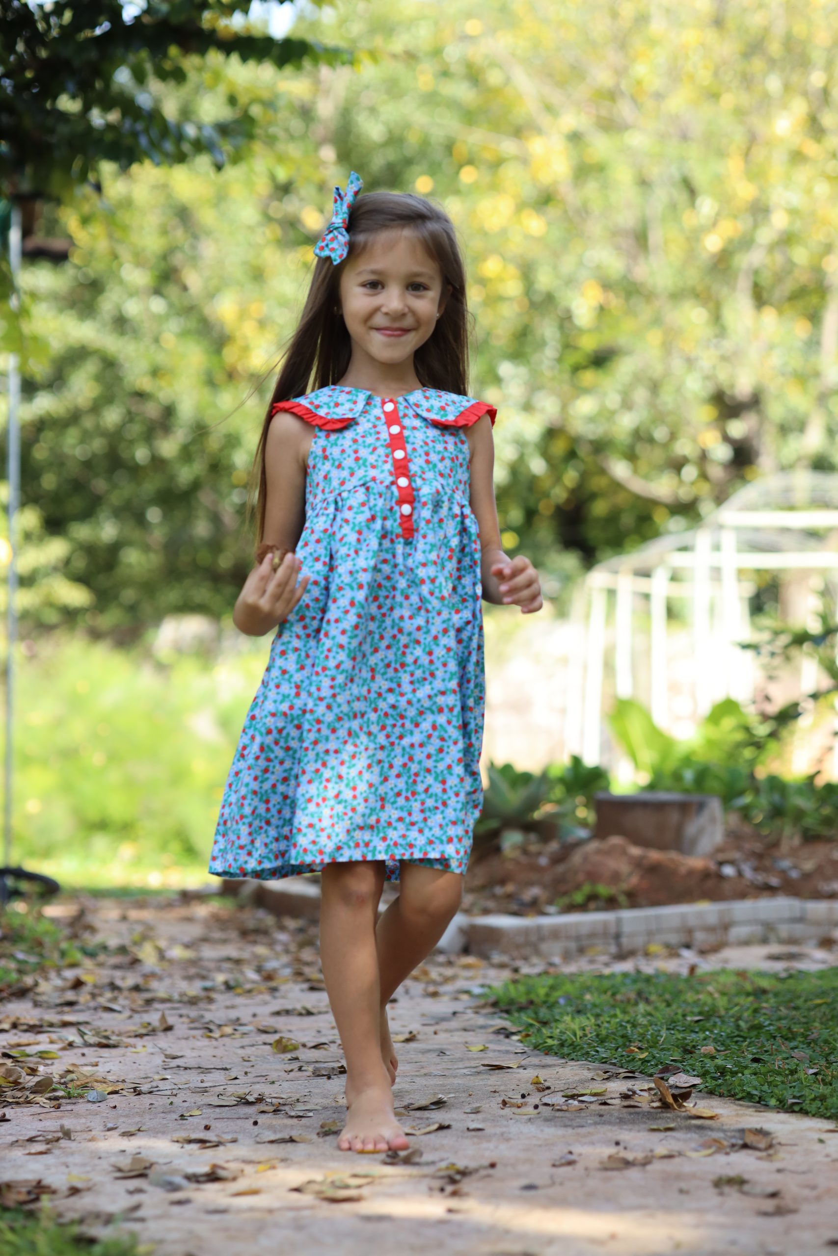 Cari is a playful, yet elegant sleeveless dress with an oversized round pointed collar. Around the collar is a playful ruffle. It has a half length button placket, fastened by snaps. Cari is an above the knee length dress with a slim to moderate fit. Have a look at our Zoey and Ashley dresses for variations on the same pattern. Select one of our recommended combinations of fabrics, or keep it simple in a single fabric. All Once Upon A Thread dresses has a lined bodice and is from woven (non-stretch) 100% cotton fabric.