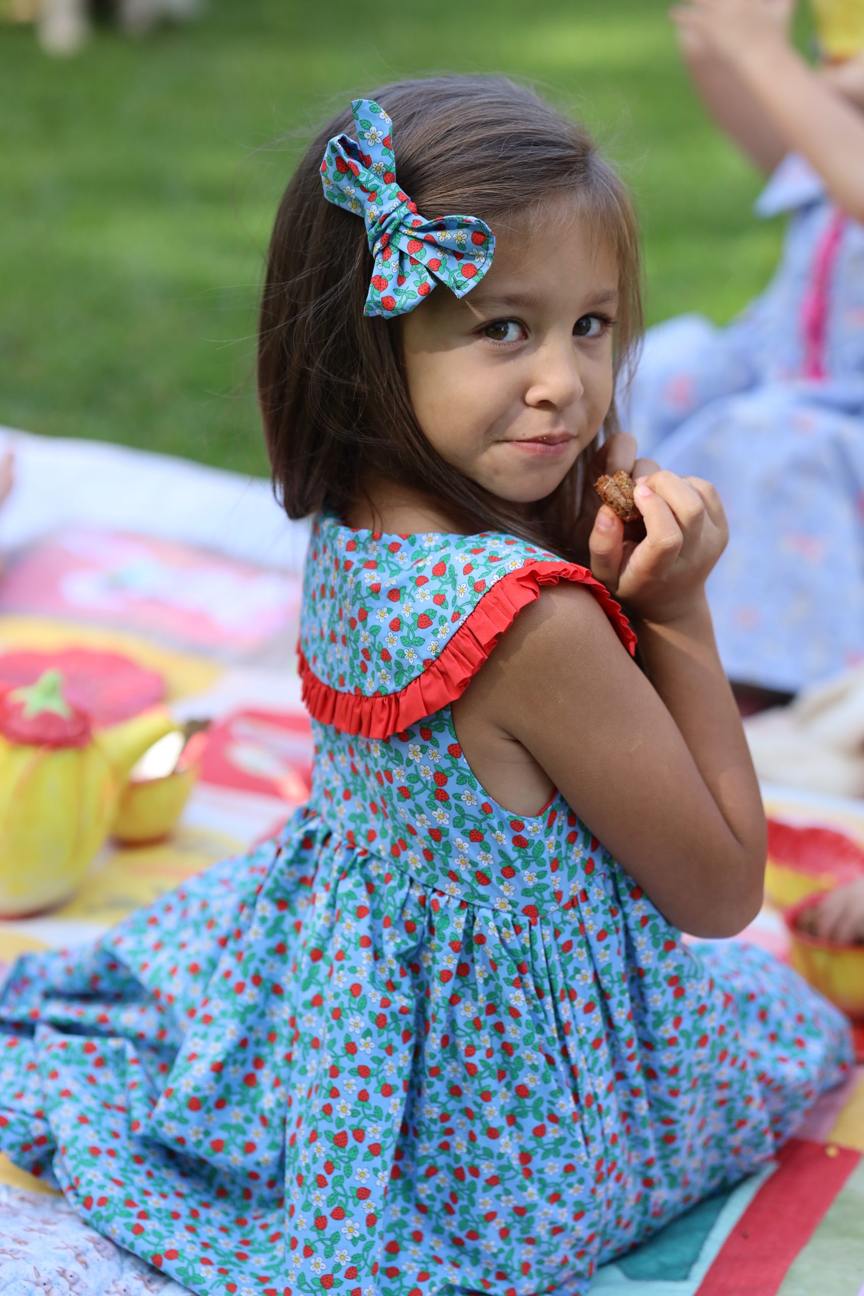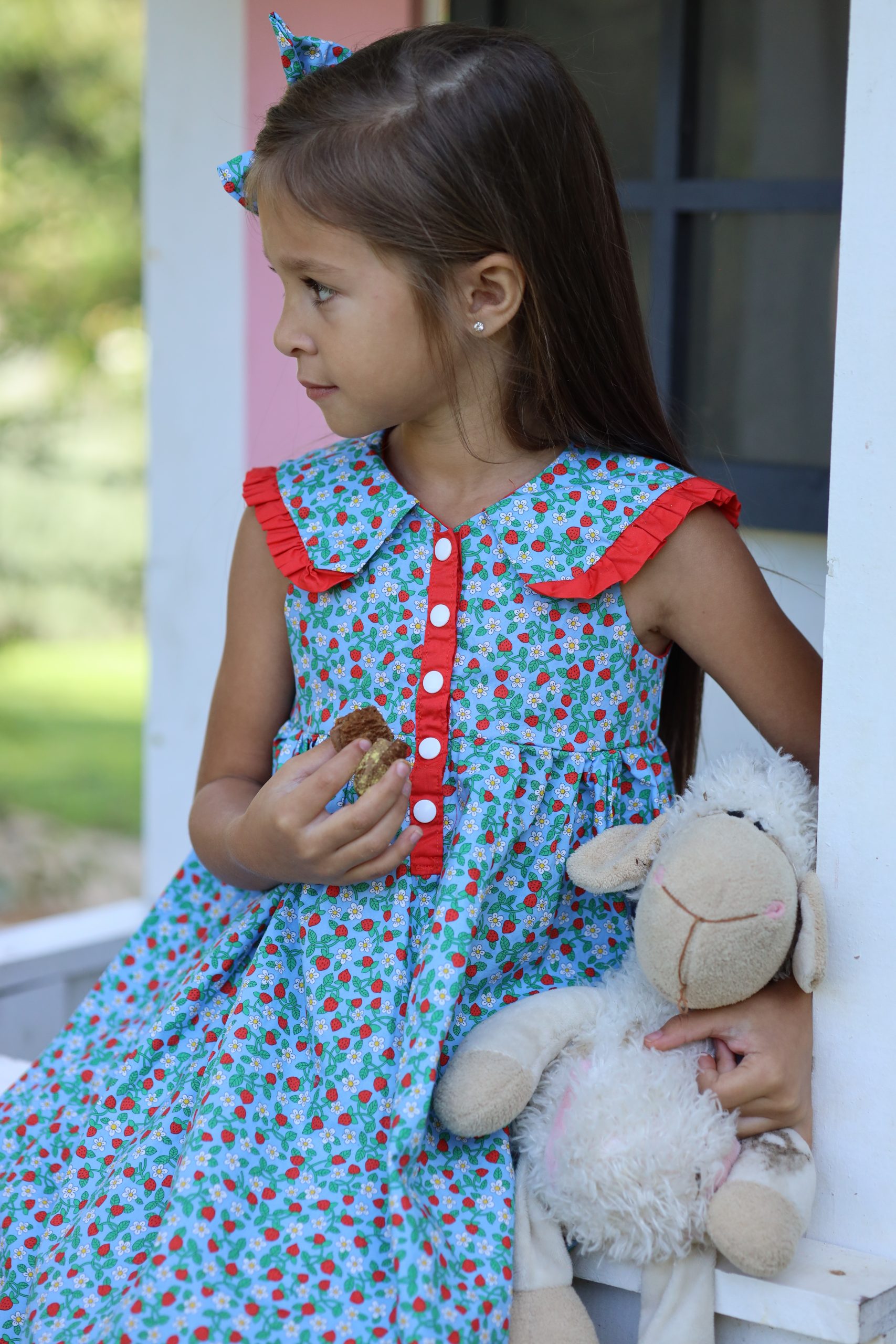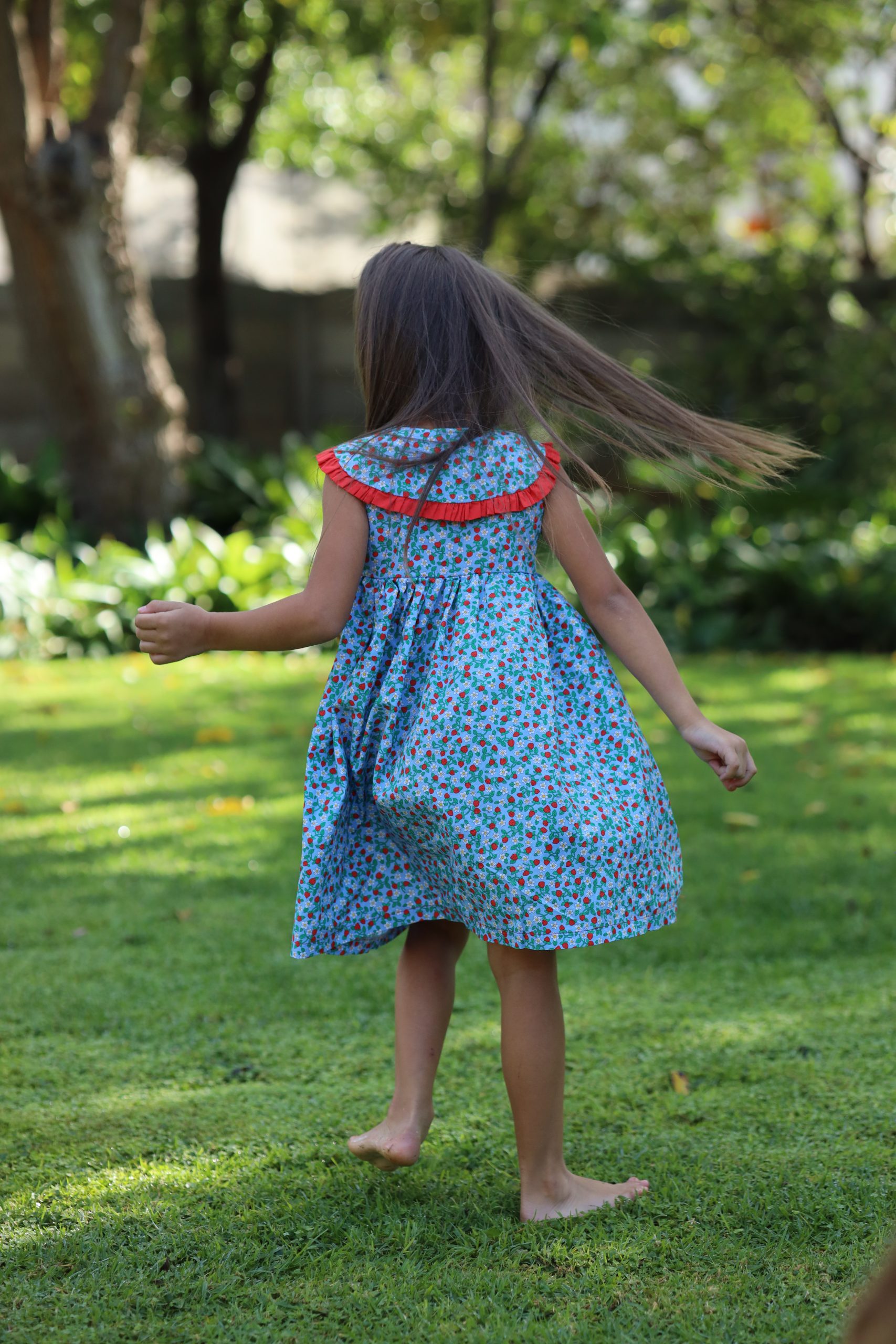 Cari is a playful, yet elegant sleeveless dress with an oversized round pointed collar. Around the collar is a playful ruffle. It has a half length button placket, fastened by snaps. Cari is an above the knee length dress with a slim to moderate fit. Have a look at our Zoey and Ashley dresses for variations on the same pattern. Select one of our recommended combinations of fabrics, or keep it simple in a single fabric. All Once Upon A Thread dresses has a lined bodice and is from woven (non-stretch) 100% cotton fabric.