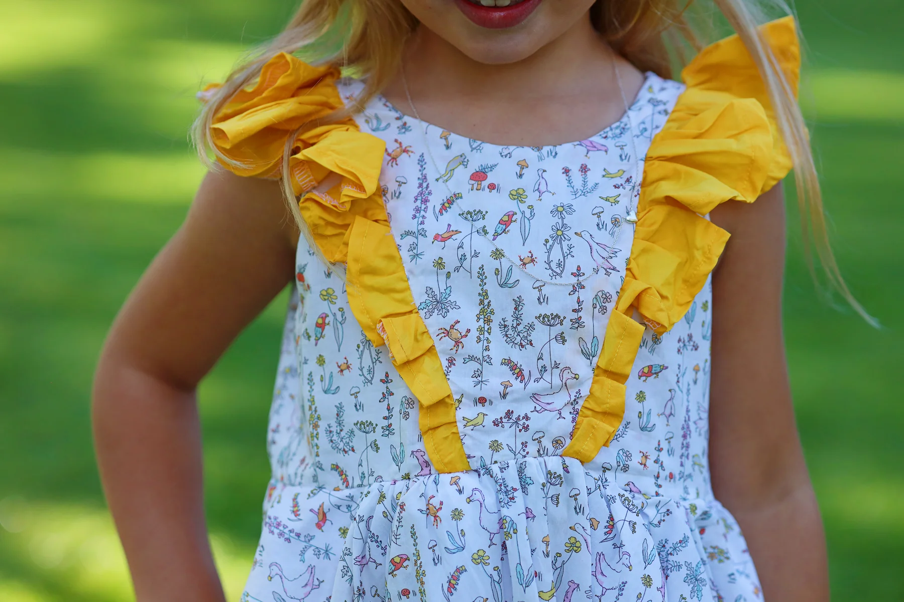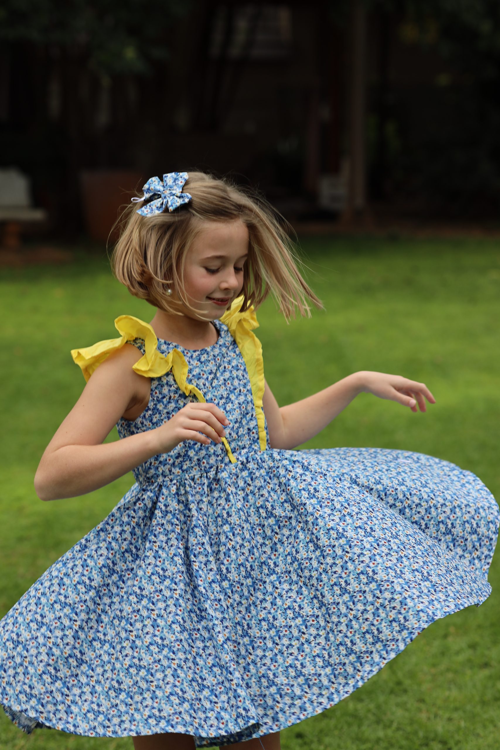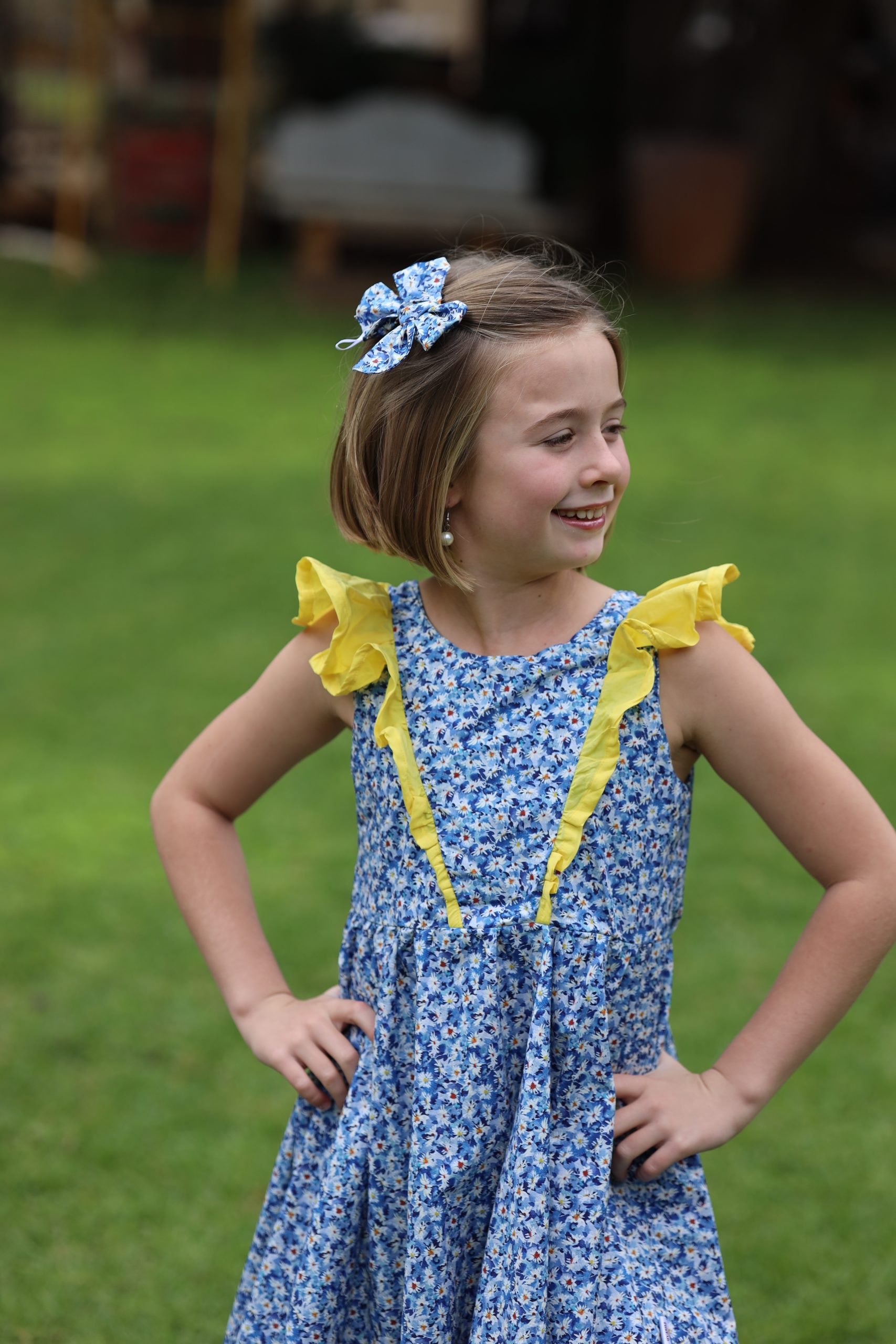 Lucy is perfect for special occasions or everyday wear. The bodice has a sweet, gathered flounce that also acts as a pretty flutter sleeve. The gathered full circle skirt gives it the perfect twirl factor! All Once Upon A Thread dresses has a lined bodice and is from woven (non-stretch) 100% cotton fabric.