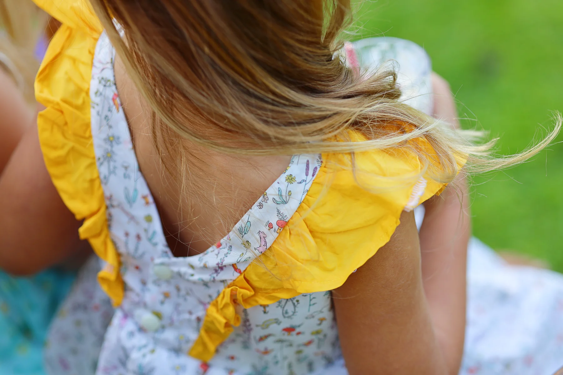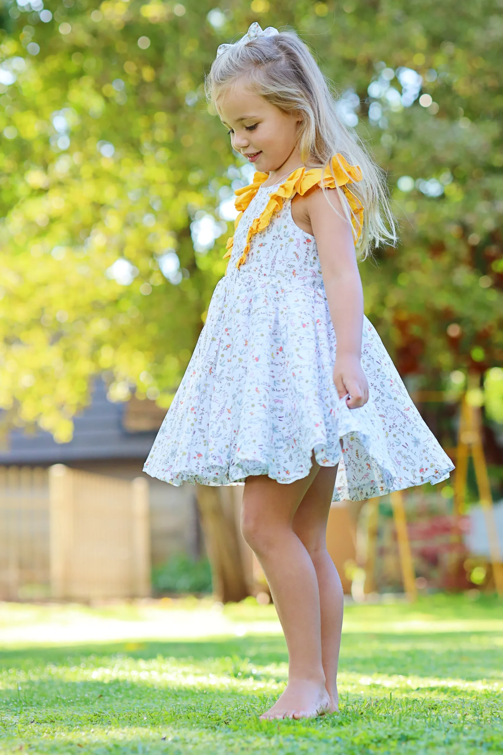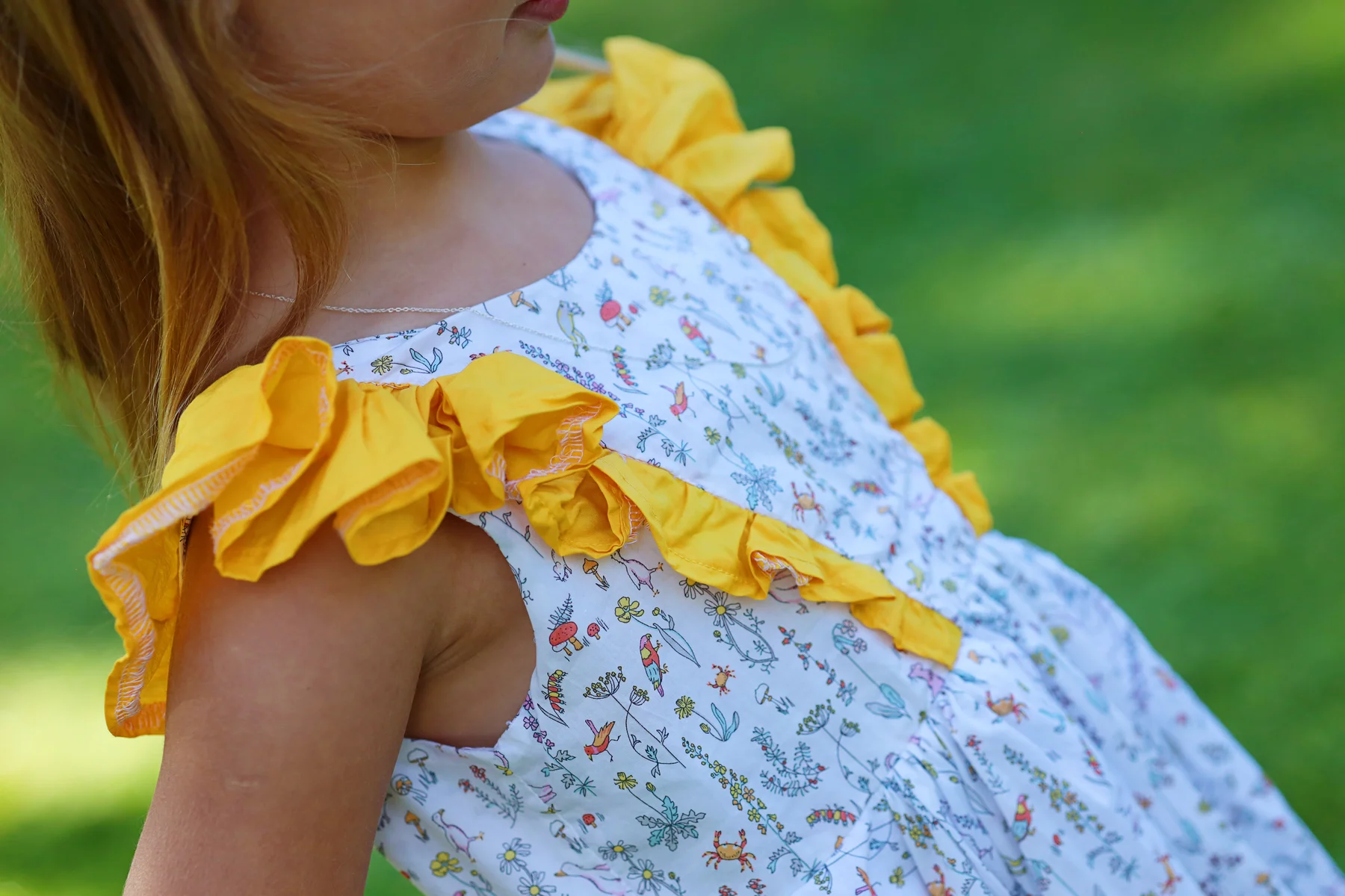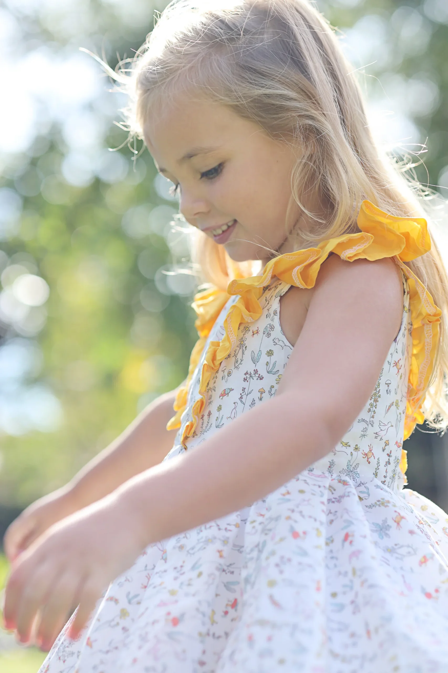 Lucy is perfect for special occasions or everyday wear. The bodice has a sweet, gathered flounce that also acts as a pretty flutter sleeve. The gathered full circle skirt gives it the perfect twirl factor! All Once Upon A Thread dresses has a lined bodice and is from woven (non-stretch) 100% cotton fabric.